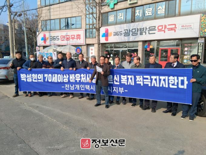 전남 개인택시 광양시지부 조합원 20여 명은 12일 오전 9시께 광양읍 개인택시 조합 사무실 앞과 인동로터리 일대에서 박성현 후보 지지 입장문을 발표했다.
