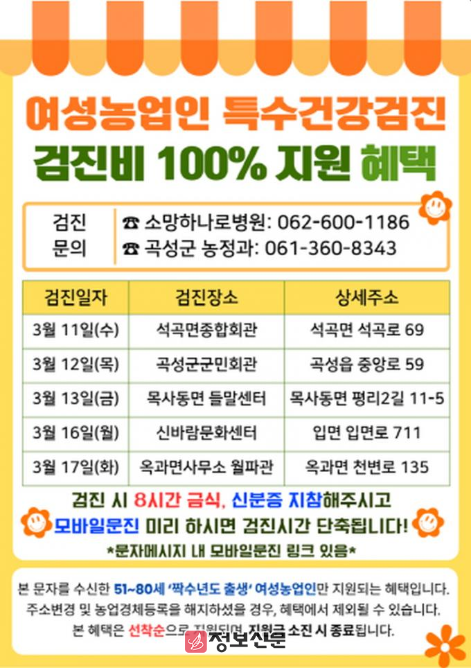 ![]() 곡성군, 여성농업인 특수건강검진 사업 추진 |