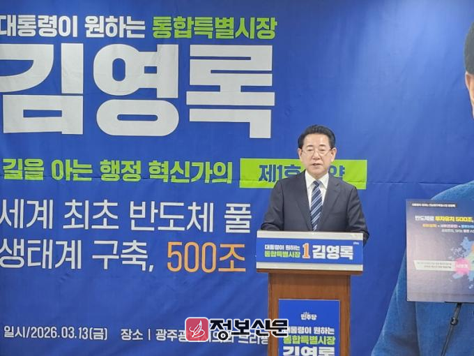 김영록 민주당 전남광주특별시장 예비후보는 13일 500조 원의 투자 유치를 통해 광주와 전남 동·서부권을 3각 축으로 연결하는 글로벌 반도체 클러스터를 조성하겠다는‘1호 경제부흥 공약’을 광주시의회 브리핑룸에서 발표했다.