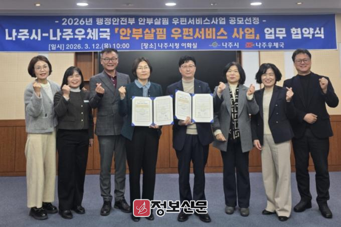 나주시는 행정안전부 ‘2026년 안부살핌 우편서비스 사업’ 공모에 선정돼 4월에 대상자를 선정하고 오는 5월부터 사업을 본격 시행할 계획이라고 13일 밝혔다. 이를 위해 나주시는 지난 12일 나주우체국과 업무협약을 체결하고 지역 내 1인 가구와 고립 은둔 가구 등 위기가구 발굴과 안부 확인을 위한 협력체계를 구축했다.