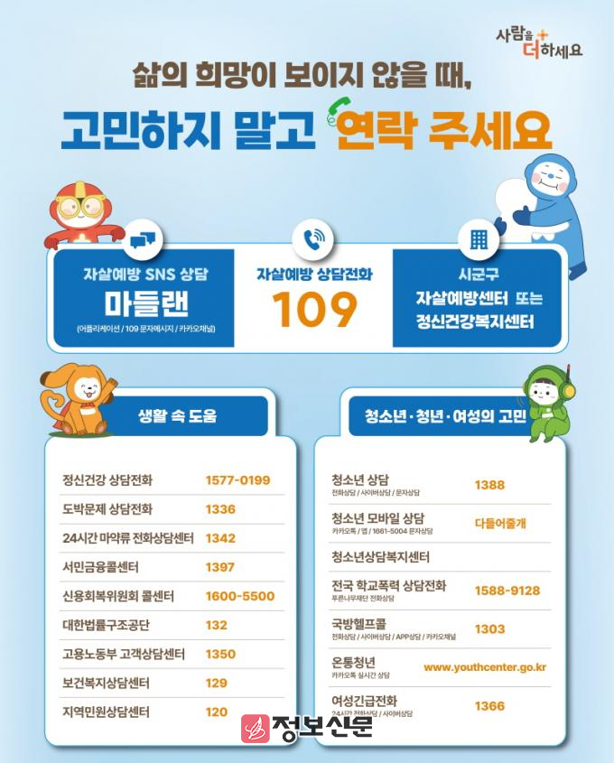 또한 도민이 쉽게 도움을 받도록 자살예방 상담전화 ‘109’와 정신건강 상담전화 ‘1577-0199’ 등 위기 상담 서비스를 적극 안내하고, 시군 정신건강복지센터와 연계해 고위험군 상담과 사례관리를 강화한다.