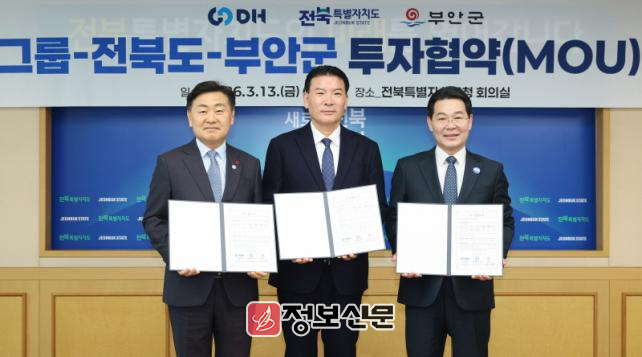 도는 13일 도청에서 DH그룹과 부안 제3농공단지(투자 면적 10만 1,836㎡) 일원에 피지컬AI·방산·수소 산업 제조기지를 조성하는 내용의 투자협약(MOU)을 체결했다. 협약식에는 김관영 전북자치도지사와 이정권 DH그룹 회장, 권익현 부안군수 등이 참석했으며, 협약 체결 후 지역 상생 협력 방안에 대한 의견을 나눴다.