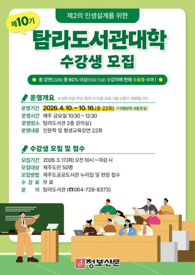 ![]() 탐라도서관, ‘제10기 탐라도서관대학’ 수강생 모집 |