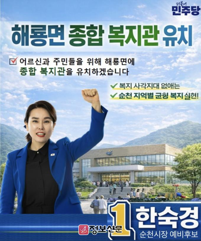 한 예비후보는 최근 보도자료 및 홍보물을 통해 “어르신과 지역 주민들이 보다 쾌적하고 편리하게 복지 서비스를 누릴 수 있도록 해룡면에 종합복지관을 반드시 유치하겠다”고 밝혔다.