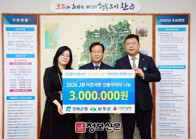 16일 전북은행은 완주군청 군수실에서 조인성 부행장과 김성두 완주군청지점장 등이 참석한 가운데 유희태 완주군수에게 ‘2026 JB이웃사랑 선물꾸러미’를 전달했다. 이번 기탁은 지속되는 물가 상승으로 생활고를 겪는 관내 저소득 가정을 실질적으로 돕고자 전북은행 측에서 마련했다.