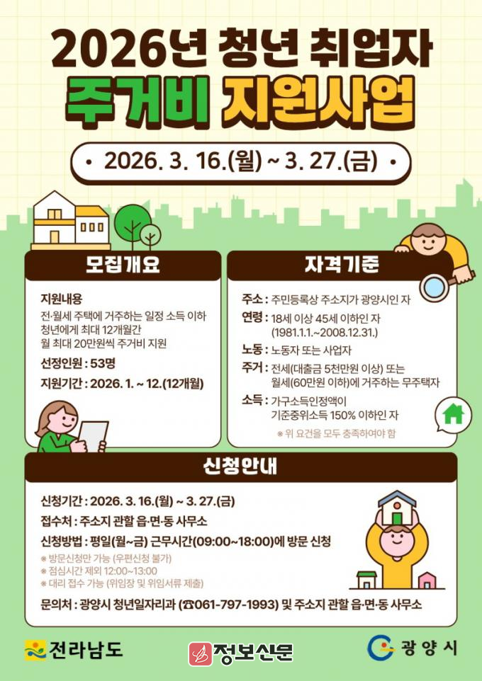 ![]() 광양시, ‘2026년 청년 취업자 주거비 지원사업’ 대상자 모집 |