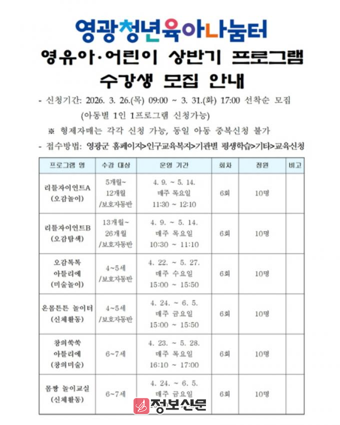 ![]() 영광청년육아나눔터, 2026년 영유아.어린이 상반기 프로그램 운영 |