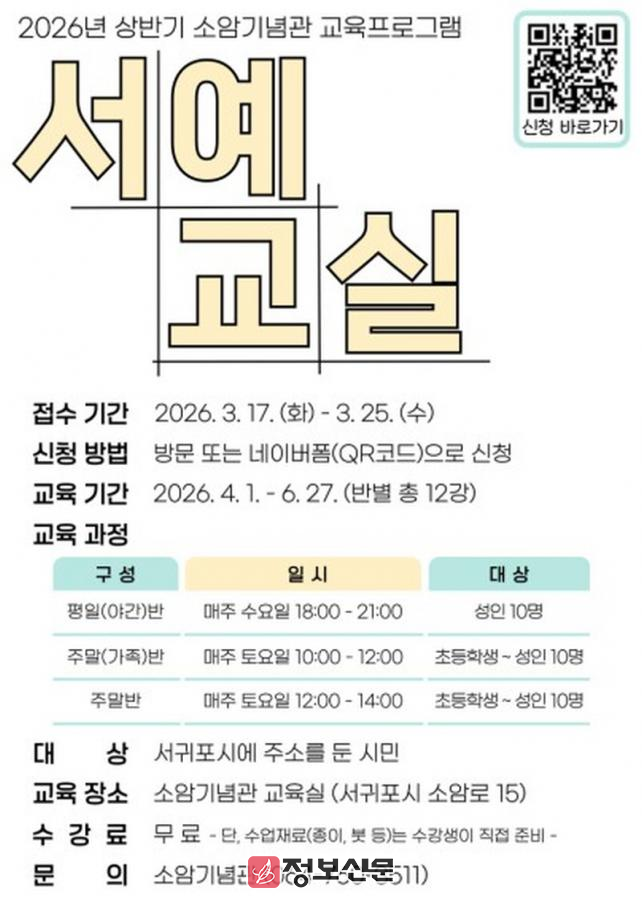 상반기 서예교실은 4월부터 6월까지 3개월간(반별 12강) 매주 수·토요일에 진행되며, 자세한 사항은 소암기념관 홈페이지(https://culture.seogwipo.go.kr/soam)를 통해 확인할 수 있다.