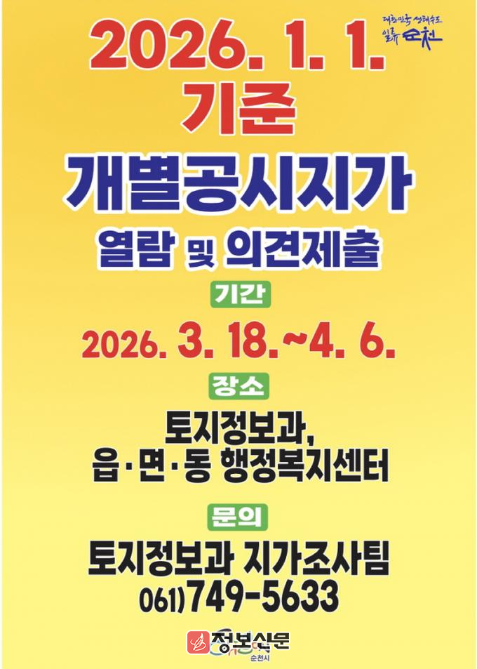 ![]() 순천시, 2026년 개별공시지가 열람 및 의견접수 |