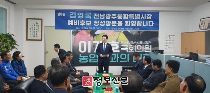![]() 김영록 민주당 전남광주특별시장 예비후보가 18일 민주당 장성지역위를 찾아 당원들과 간담회를 갖고 있다.