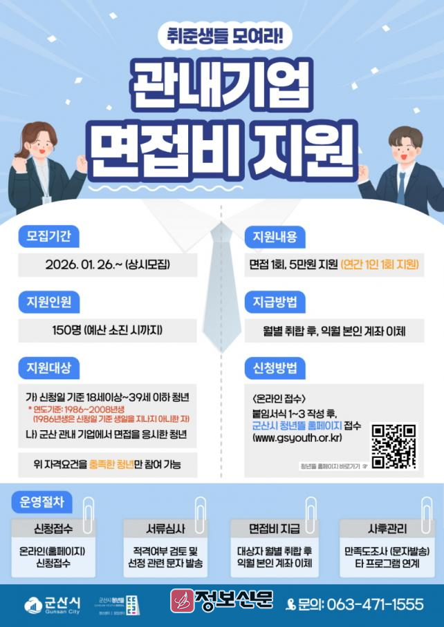 ![]() 군산시 청년뜰, 청년 구직자 대상 관내 기업 면접비 지원사업 추진 |