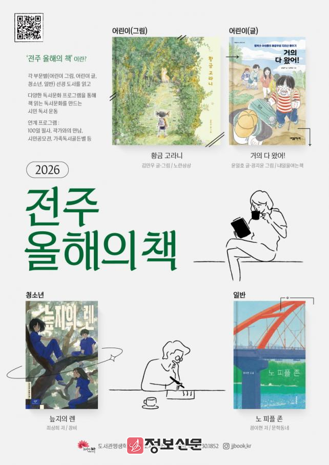 전주시는 시민들과 함께 읽을 ‘2026 전주 올해의 책’으로 △어린이(그림) 부문 황금 고라니(김민우 글·그림, 노란상상) △어린이(글) 부문 거의 다 왔어!(윤일호 글·정지윤 그림, 내일을여는책) △청소년 부문 늪지의 렌(최상희 저, 창비) △일반 부문 노 피플 존(정이현 저, 문학동네) 총 4권을 선정했다고 19일 밝혔다.