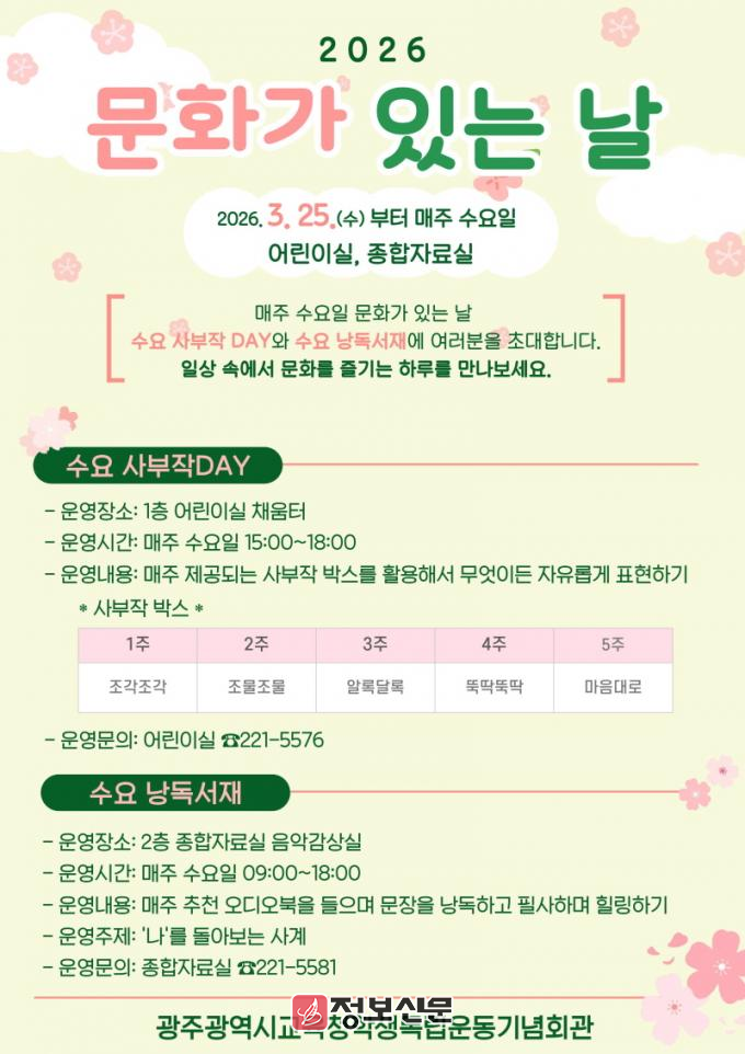 학생독립운동기념회관 김용일 관장은 “시민과 어린이들이 일상을 작은 축제처럼 즐길 수 있는 열린 도서관을 만들겠다”며 “매주 수요일마다 열리는 ‘문화가 있는 날’ 프로그램에 많은 시민과 어린이들이 참여하길 바란다”고 말했다.
