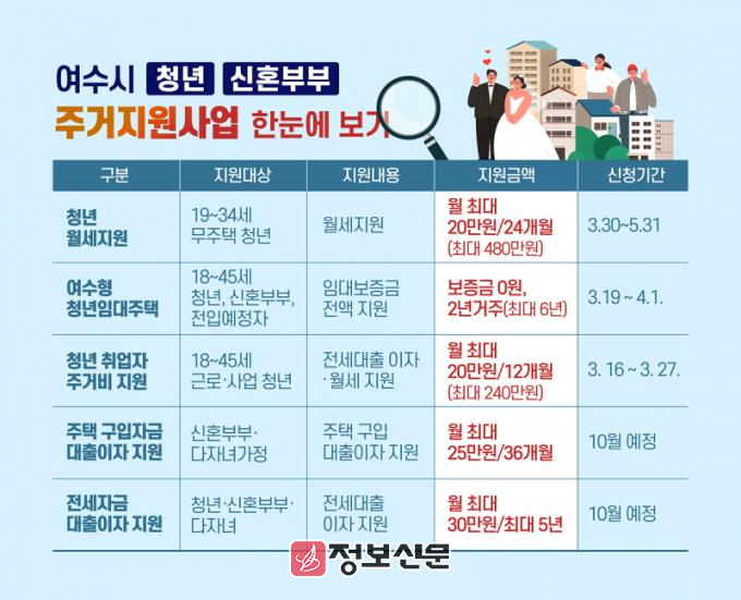 이와 함께, 청년·신혼부부 전세자금 대출이자 지원사업도 계속 추진된다. 여수시에 거주하거나 전입 예정인 45세 이하 청년이 대상으로 부부합산 연소득 1억 원 이하 등의 조건을 충족해야 한다.