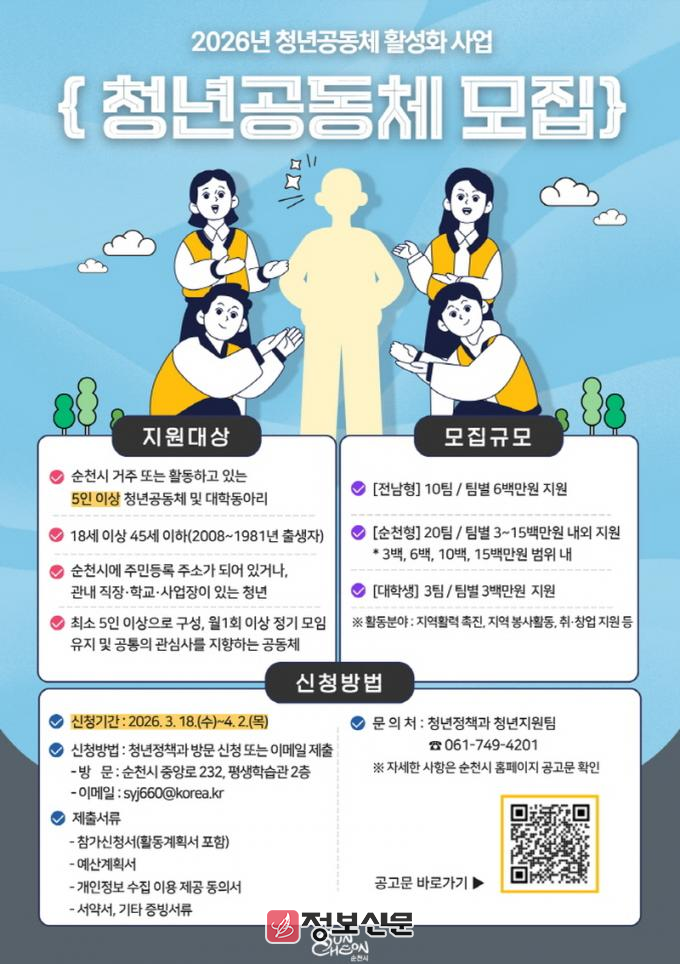 ![]() 순천시, 2026년 청년공동체 활성화 사업 참여팀 모집 |