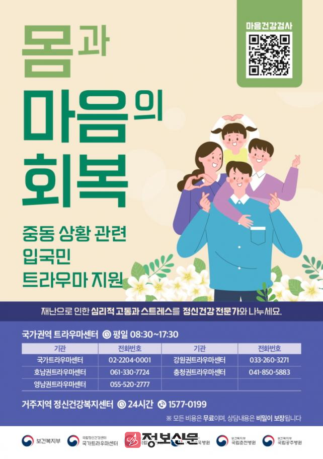 지원 대상은 중동지역 상황으로 정신적 피해를 입은 입국민과 재외동포, 전쟁 관련 소식 등으로 심리적 어려움을 겪고 있는 지역 주민이다.