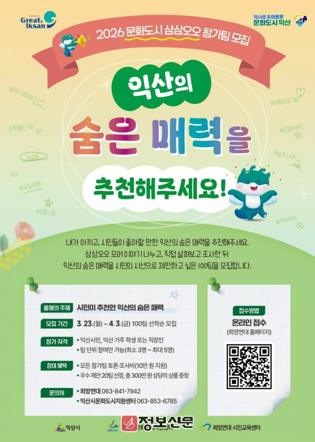익산시는 익산시문화도시지원센터, 희망연대와 함께 23일 '2026 문화도시 삼삼오오' 참가팀 모집을 시작했다. 문화도시 삼삼오오는 시민이 팀을 이뤄 익산 곳곳을 탐방하며 잘 알려지지 않은 공간과 이야기, 콘텐츠를 발굴하고 직접 추천하는 참여형 프로그램이다.
