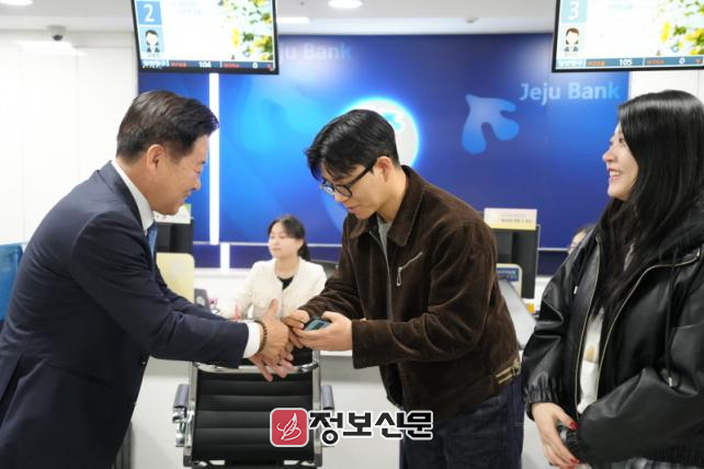 오영훈 지사는 제주은행 공항지점 직원들을 만나 “탐나는전은 관광객의 소비를 지역 상권으로 직접 연결하는 핵심 고리”라며, “접점에서 고생하는 직원들의 노력이 제주 경제 활성화의 마중물이 되고 있다”고 격려했다.