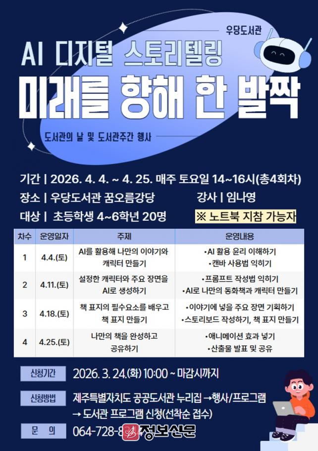 참가 신청은 3월 24일(화) 오전 10시부터 제주특별자치도 공공도서관 누리집(https://jeju.go.kr/lib)에서 선착순으로 접수하면 된다.