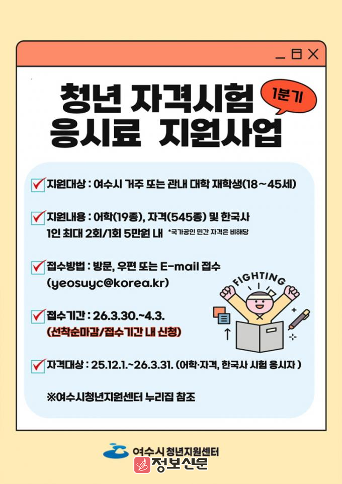 ![]() 여수시, ‘청년 자격시험 응시료’ 지원사업 확대 추진 |