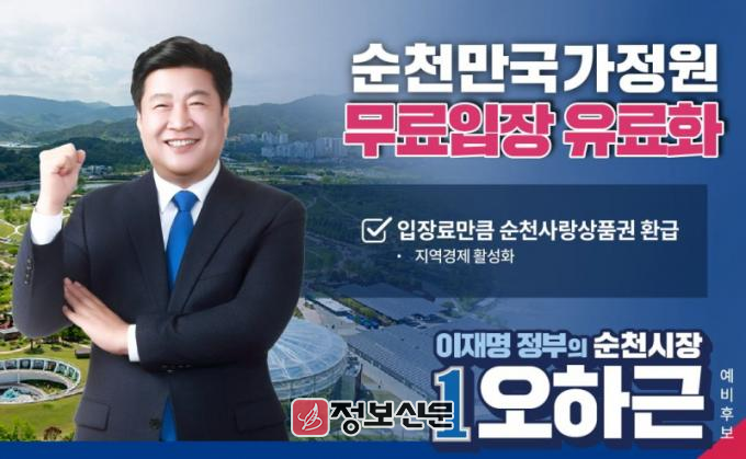 오하근 순천시장 예비후보는 27일 광주 KBC '뉴스와이드'에 출연을 통해 순천만국가정원의 무료입장객을 유료화하고, 그 입장료 전액을 순천사랑상품권으로 환급하는 시스템을 도입하겠다고 밝혔다.