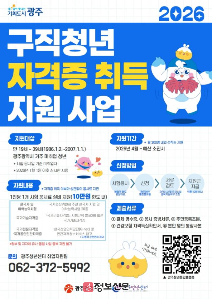 ![]() 광주광역시, 구직청년 자격증 취득지원 사업 및 마음건강상담소 운영 |