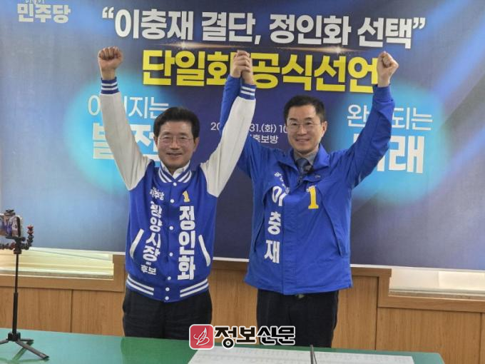 더불어민주당 이충재 광양시장 예비후보는 31일 오전10시30분 광양시청 열린홍보방에서 정인화 예비후보와의 단일화를 전격 선언하며 ‘광양 재건’을 위한 원팀 (One-Team)의 탄생을 알렸다.