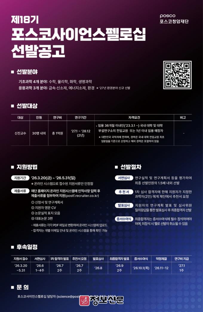 ![]() 포스코청암재단, 제18기 포스코사이언스펠로십 모집 |