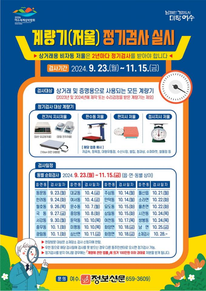 읍,면,동별 검사 일정은 여수시청 누리집 고시·공고란에서 확인할 수 있으며 기타 자세한 사항은 여수시 경제일자리과(☎061-659-3609) 또는 읍면동 주민센터에서 안내받을 수 있다.