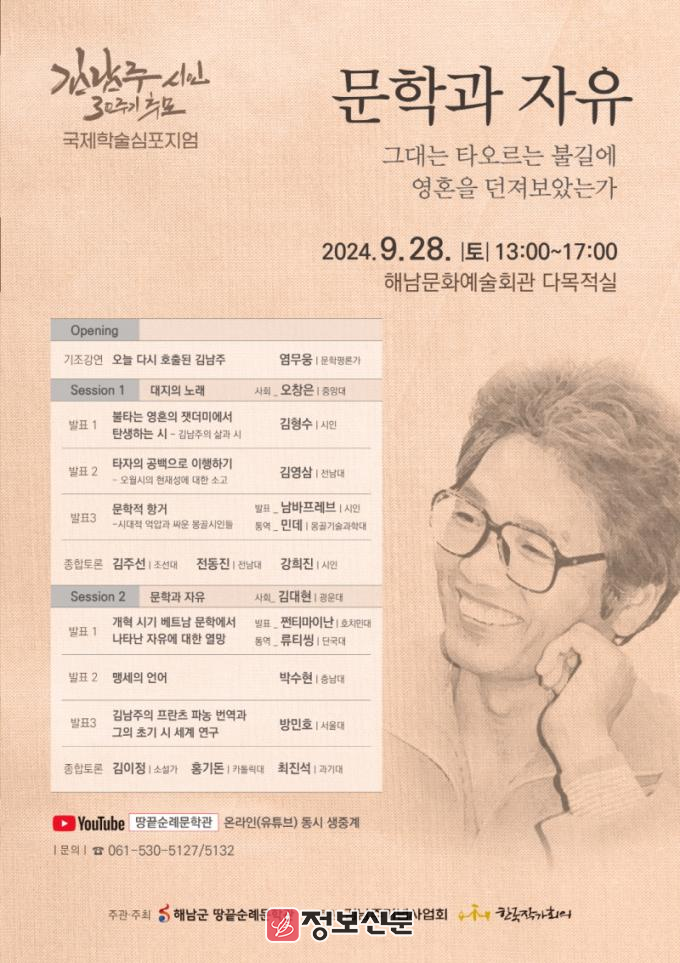 오는 9월 28일 오후1시 해남문화예술회관 다목적실에서 열리는 심포지엄은 김남주 시인의 문학정신을 관통하는 소재인‘문학과 자유: 그대는 타오르는 불길에 영혼을 던져보았는가’를 주제로 국내외 다양한 작가, 평론가, 연구자들이 모여 심도 있는 학술 행사를 꾸릴 예정이다. 심포지엄 전 과정은 땅끝순례문학관 유튜브 채널을 통해 온라인 생중계된다.