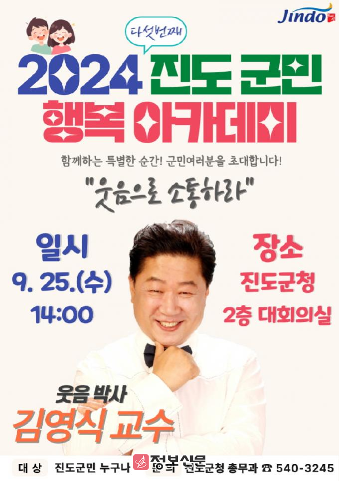 진도 군민행복 아카데미는 사전 신청 없이 누구나 입장 가능하며, 이번 아카데미는 ‘웃음박사’로 잘 알려진 국제웃음요가문화연구소 김영식 소장을 초청해 ‘웃음으로 소통하라’는 주제로 강연을 진행한다.