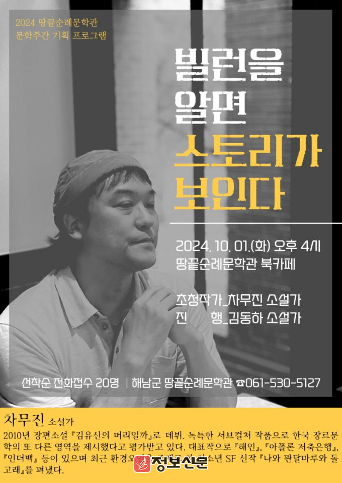 오는 10월 1일 오후 4시 땅끝순례문학관 북카페에서 한국 장르문학의 귀재라 불리는 차무진 소설가를 초청해 「빌런을 알면 스토리가 보인다」를 주제로 특별 프로그램을 진행한다.