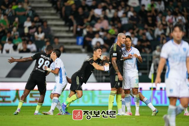 돌발상황이 생겼다. 후반 19분 대전 수비에 밀린 송민규가 박스 안에서 넘어졌다. 송민규는 오른쪽 어깨에 통증을 호소했다. 송민규는 부축을 받고 그라운드 바깥으로 나와 치료를 받았다. 결국 송민규는 김진규와 교체됐다.