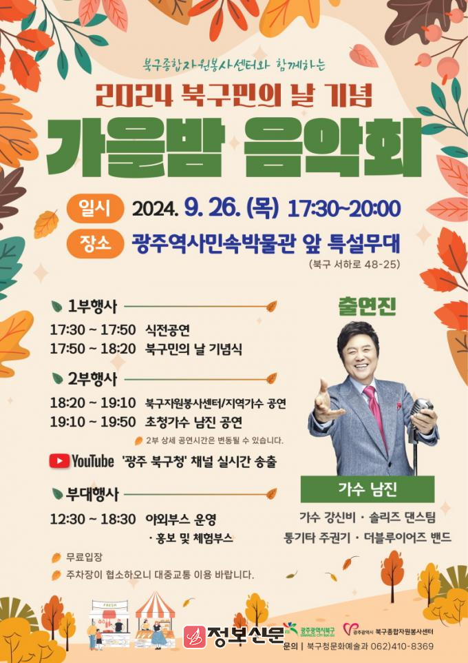 이어서 열리는 가을밤 음악회 무대에는 북구자원봉사센터, 지역 가수들의 흥겨운 공연과 메인 초대 가수인 ‘남진’의 ‘축하 공연’이 펼쳐지며 주민들에게 가을밤 낭만을 선사할 예정이다.