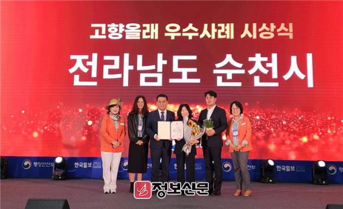 ![]() 순천시는 24일 대구 엑스코에서 열린 2024년 지역활성화 우수사업 발표회에서 워케이션 분야 최우수 지자체로 선정되어 행정안전부 장관상을 수상했다. (좌측부터 순천시 해설사 나희경/ 순천시 관광과 정원워케이션 팀장 조미라/ 행안부 지방재정경제실장 한순기/ 순천시 관광과 과장 양효정/ 순천시 관광과 정원워케이션 주무관 배수훈/ 순천시 해설사 김대리)