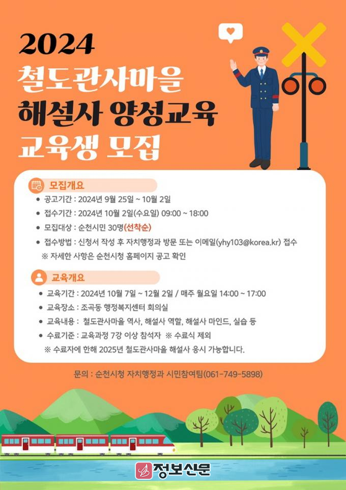 ![]() 순천시, 철도관사마을 해설사 양성과정 교육생 모집 |