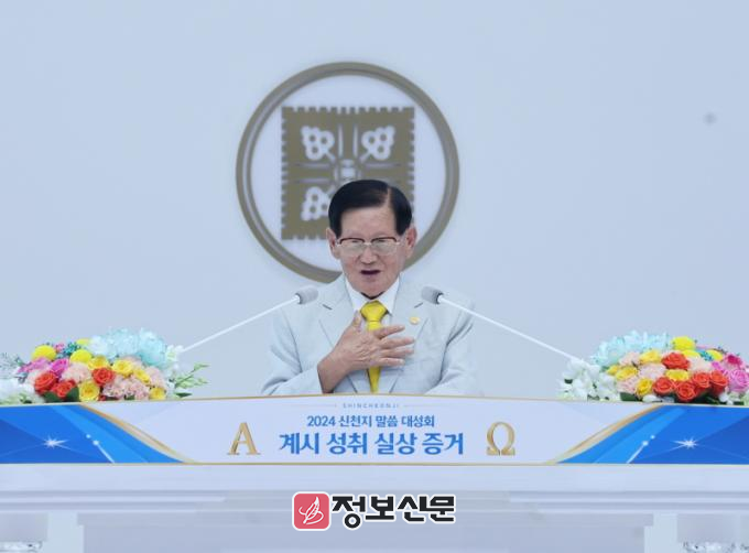 ![]() [사진 제공 = 신천지예수교회] 29일 부산 안드레연수원에서 ‘2024 신천지 계시 성취 실상 증거 말씀대성회’가 열리고 있는 가운데 강연자로 나선 이만희 총회장이 강연하고 있는 모습. |