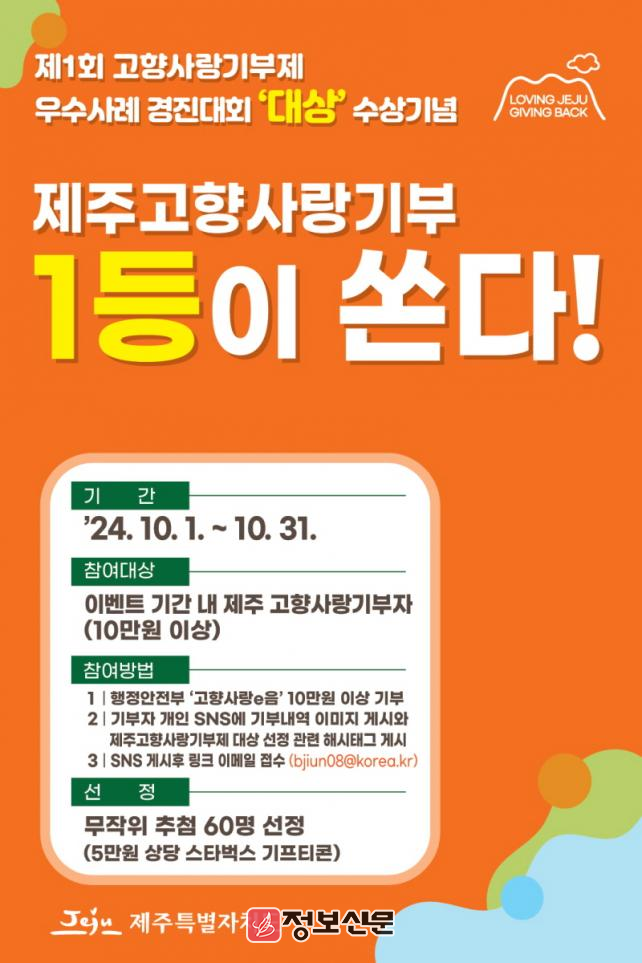 ![]() 제주특별자치도, 10월 한 달간 제주고향사랑기부 ‘1등이 쏜다!’ 이벤트 진행 |