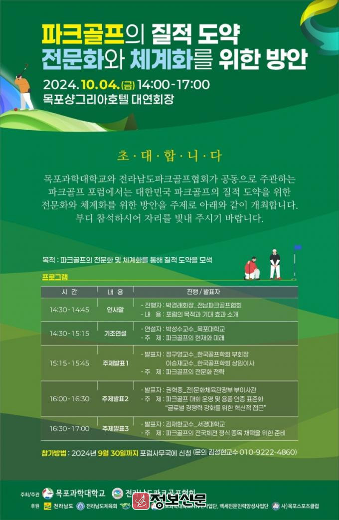 목포과학대학교(총장 이호균)와 전라남도파크골프협회(회장 박경래)에 따르면, 목포과학대학교와 전라남도파크골프협회가 공동으로 주관하여 파크골프의 질적 도약과 전문화를 위한 방안을 모색하기 위해 4일 오후 2시30분부터 목포 샹그리아호텔 연회장에서 '파크골프 포럼'을 공동 개최한다고 30일 밝혔다.