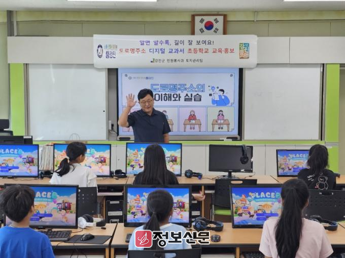 ![]() 강진군 토지관리팀 서재승 팀장이 강진동초등학교에서 도로명주소 교육을 하고 있다. |