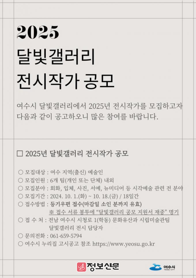 ![]() 여수시(시장 정기명)가 오는 18일까지 2025년 달빛갤러리 전시 작가를 공개 모집한다. |