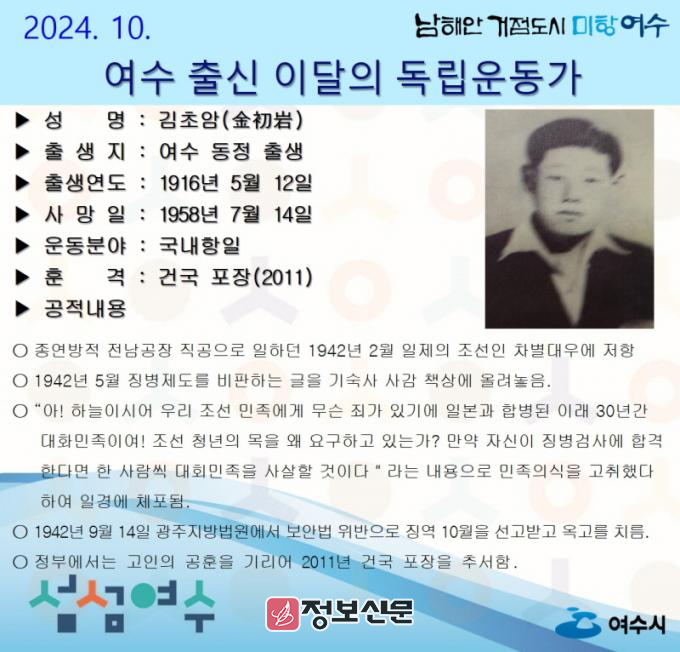 ![]() 여수시(시장 정기명)가 10월의 독립운동가로 여수 동정 태생 ‘김초암(金初岩) 선생’을 선정했다.