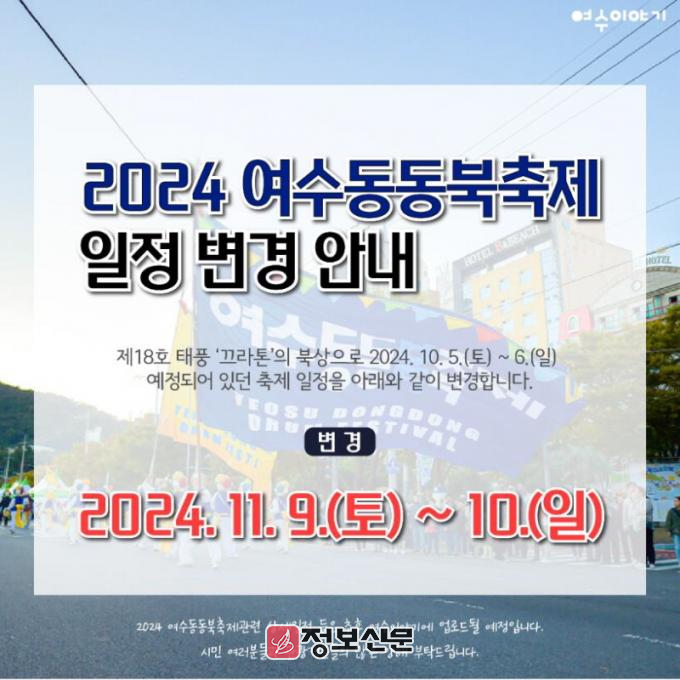 ![]() 여수를 대표하는 문화 체험형 축제 2024 ‘여수동동북축제’가 제18호 태풍 ‘끄라톤’ 북상에 따라 11월 9~10일로 연기됐다.