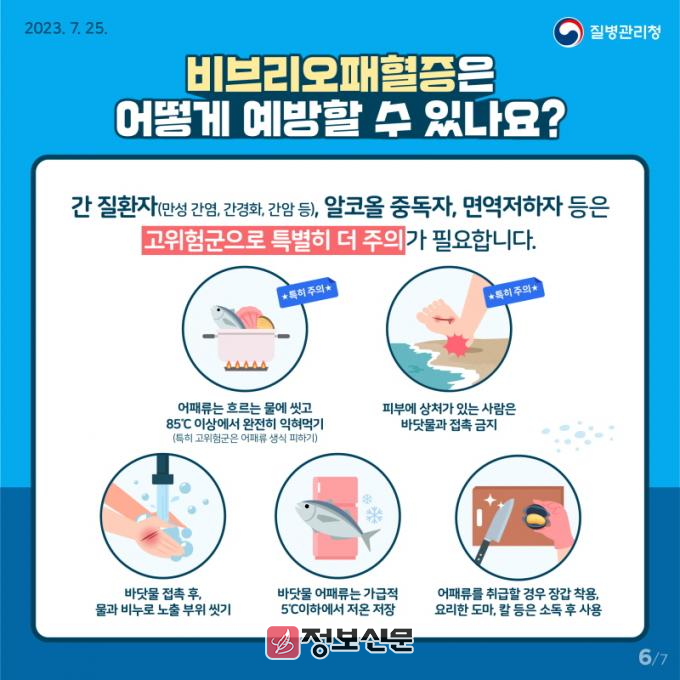 이를 예방하기 위해서는 ▲어패류 완전히 익혀 먹기 ▲피부에 상처가 있는 사람은 바닷물과 접촉 금지 ▲어패류는 5도 이하로 저온 저장, 85도 이상 가열 처리 ▲어패류 조리 시 흐르는 수돗물로 씻기 ▲어패류 취급 시 장갑 착용 ▲도마, 칼 등 소독 후 사용하기 등 예방수칙을 준수해야 한다.