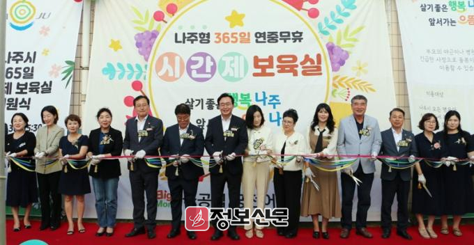 나주시(시장 윤병태) 지난달 30일 송월동에 위치한 궁전어린이집에서 ‘365일 시간제 보육실 개원식을 개최했다고 2일 밝혔다. 365일 시간제 보육은 맞벌이, 주말·야간 근무, 응급 진료 및 입원 등 부모의 긴급한 사정으로 직면한 자녀 보육 고민을 해소하기 위한 시책 사업이다.