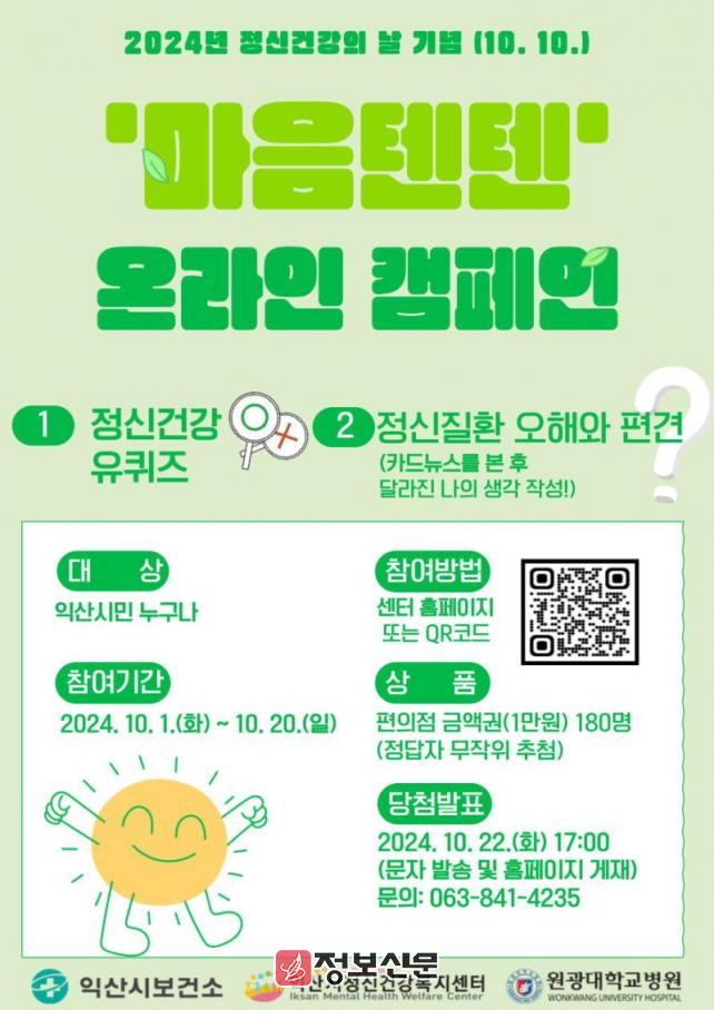 '정신건강 유퀴즈'는 오는 20일까지 익산시정신건강복지센터 누리집 또는 인스타그램에서 참여할 수 있다. 정신건강의 오해와 편견에 대한 문제를 풀고 카드 뉴스를 읽은 후 생각을 작성하면 정답자 중 180명을 추첨해 소정의 상품을 제공한다. 당첨자는 22일 문자로 개별 안내된다.