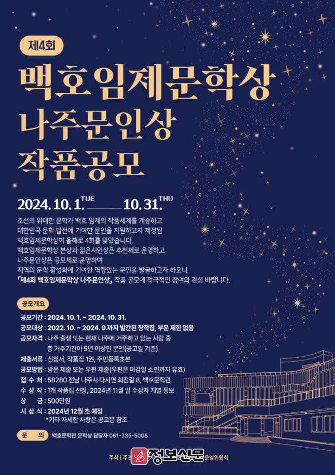 자세한 내용은 나주시 홈페이지 공고문을 확인하거나 백호문학관(☎061-335-5008)으로 문의하면 된다.