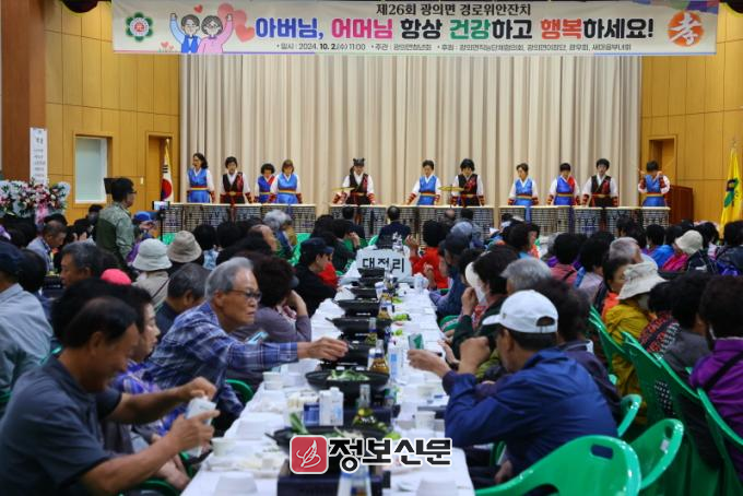 광의면 행사는 광의면 청년회가 주관해 지역사회 어르신에 대한 존경과 감사의 마음을 담아 모범 노인과 효행자 등을 표창하고, 체육행사, 위문 공연 등으로 어르신들의 눈과 귀를 즐겁게 해드렸다.