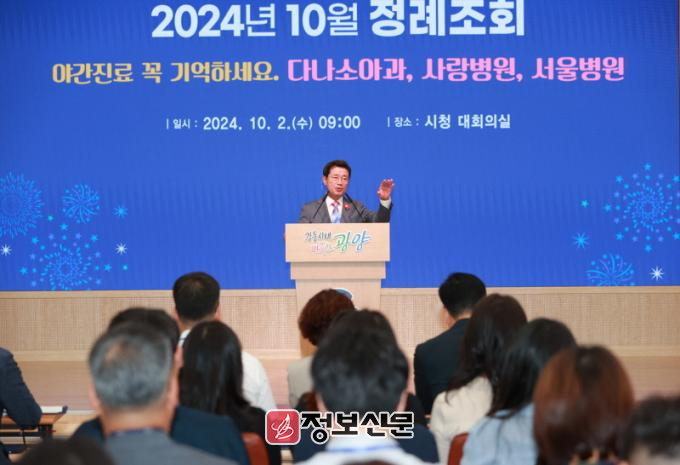 10월 정례 조회를 마무리 짓는 순서에서 “4분기의 첫 달인 10월에는 연초에 세웠던 개인의 목표, 조직의 목표들을 상기해봐야 한다”라고 말한 정인화 시장은 “남은 3개월을 보람 있는 시간으로 만들어보겠다는 마음가짐을 가지고 업무 성과 달성을 위해 최선을 다해달라”라고 당부했다.
