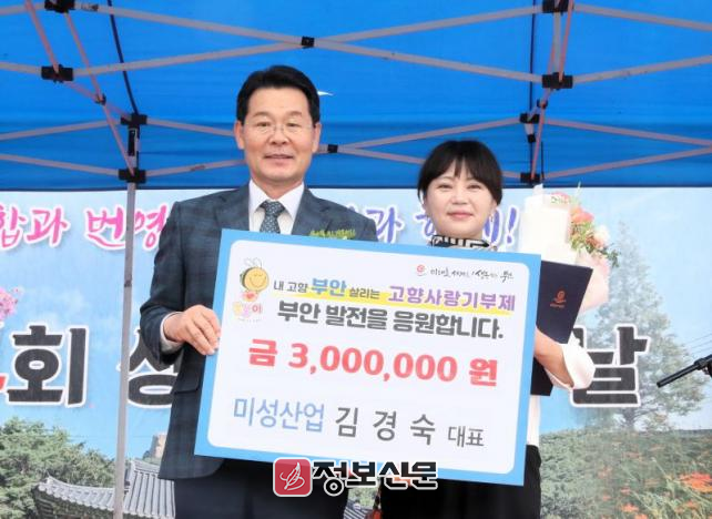 부안군 관계자는 “부안군의 발전을 위한 고향사랑기부제에 동참해 주신 미성산업 김경숙 대표님께 감사드린다.”라며 “우리 부안군에 보내주신 기탁금으로 상서면민들뿐만 아니라 다양한 주민들의 복지와 공동체 활성화에 기여할 예정이다.”라고 말했다.
